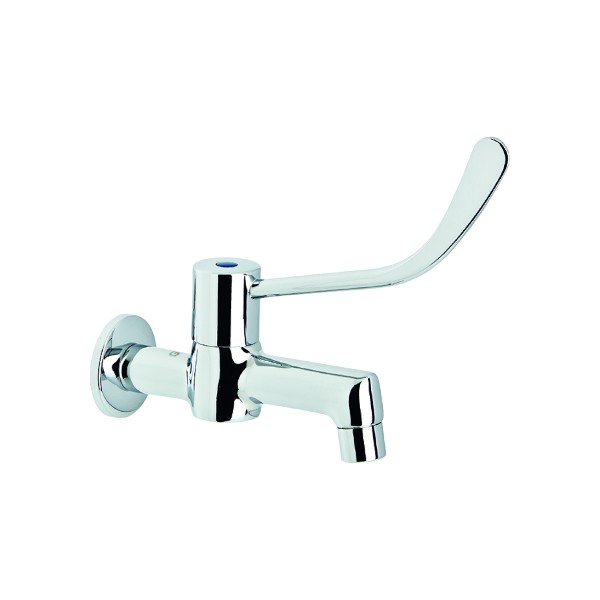 Grifo de lavabo monomando medical para instalar en pared. Grifo en latón CC754S y maneta en Zamak cromado, cromado según EN 248. Provisto de montura cerámica ¼ vuelta en latón y aireador plástico antical.