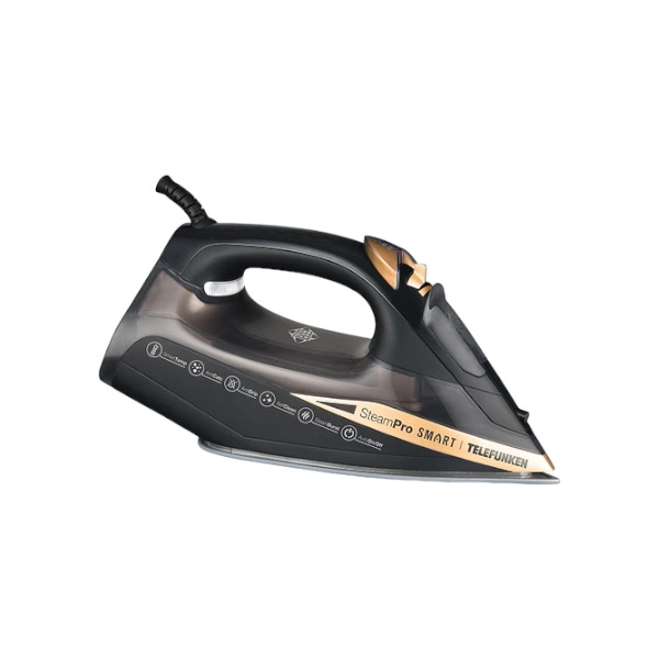 STEAMPRO-SMART de Telefunken es una plancha a vapor con base de cerámica, cuenta con función inteligente off sin movimiento, es antiadherente para deslizarse fácilmente en todo tipo de tejido, su base posee mayor cobertura garantizando cubrir una mayor parte de tus prendas logrando planchar en menos tiempo, su potencia máxima es de 2200W con selector de temperatura automático y golpe de vapor para un mejor planchado, además cuenta con sistema anticalcificación.