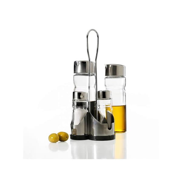 El set de 5 piezas de alcuza Clásica Allegra es un clásico de nuestros productos, botellas confeccionados en vidrio, tapas metálicas con dispensadores, Ideales para todas las celebraciones y uso común.