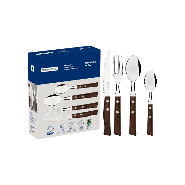 Para añadir una atmósfera rústica a su mesa y a todas sus comidas, cuente con el juego de cubiertos Tramontina Tradicional con láminas en acero inoxidable y mangos de madera natural de 24 piezas. Ideales para acompañar durante el día a día, posee piezas con láminas de acero inoxidable, donde los cuchillos garantizan un excelente poder de corte y los tenedores y cucharas tienen estampado y espesor especiales que los hacen más resistentes. ¡Los mangos son de madera y harán su mesa más tradicional y llena de estilo!