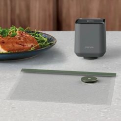 Contenido del kit: 1 selladora al vacío, 5 bolsas para selladora reutilizables de 23×26 cm c/u, 1 cable cargador USB, 1 clip para cierre de las bolsas.